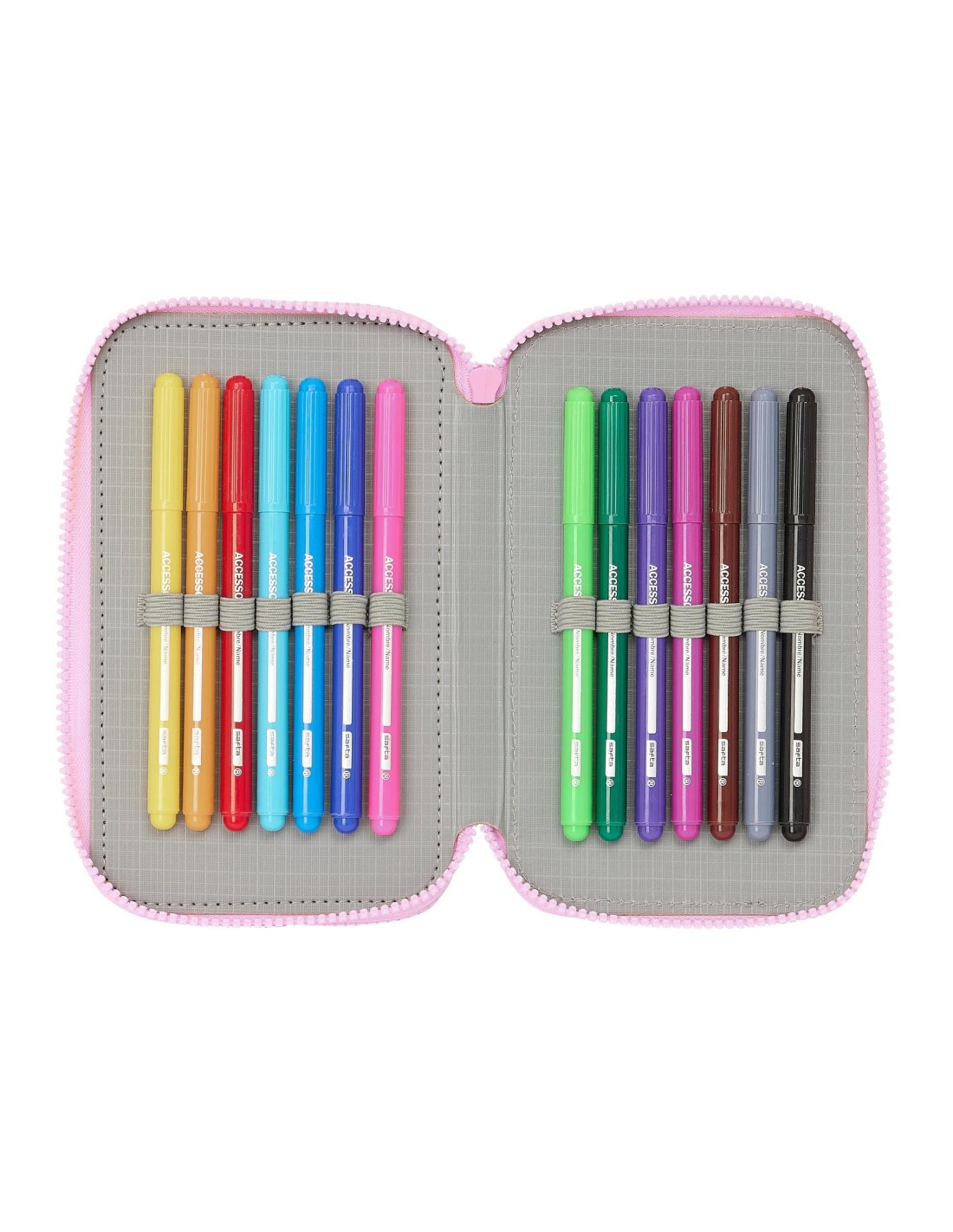 Tamaño: 12,5x5,5x19,5cm. Contiene 36 piezas: goma, lápiz de grafito, bolígrafo azul, sacapuntas, regla azul grabada, y semicírculo (primer compartimento), 16 colorines de madera (segundo compartimento). 14 rotuladores de colores (tercer compartimento).