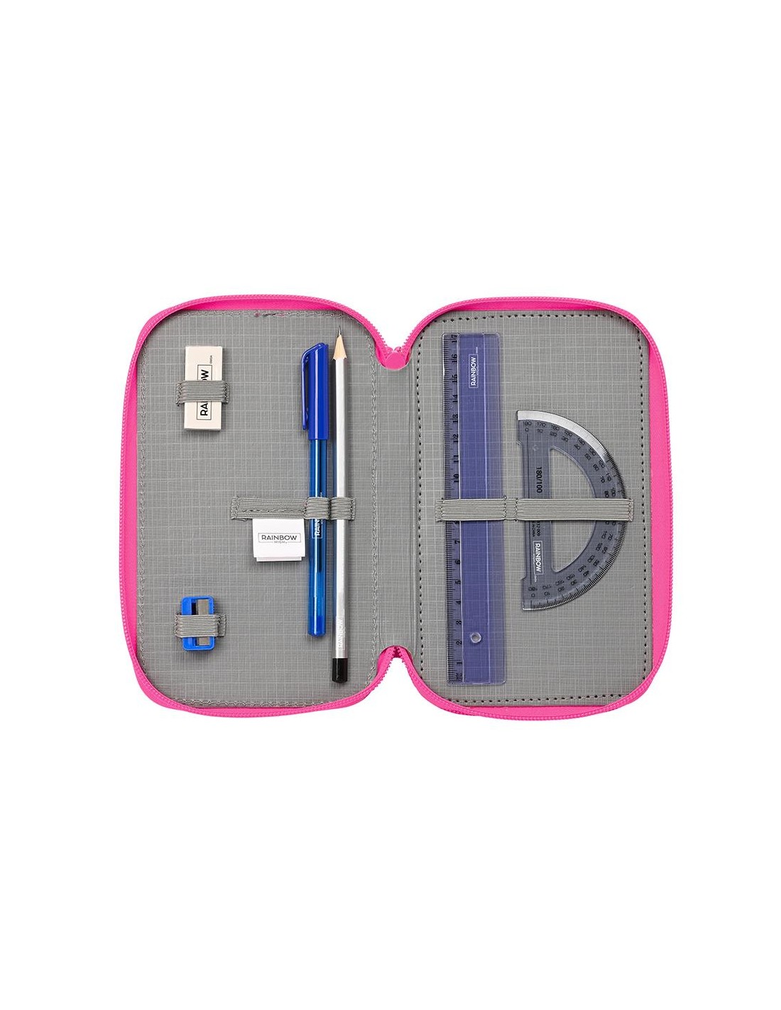 Tamaño: 12,5x5,5x19,5cm. Contiene 37 piezas : goma, lápiz de grafito, bolígrafo azul-rojo, sacapuntas, regla azul grabada, y semicírculo (1er compartimento), 16 colorines de madera (2º compartimento) 14 rotuladores de colores (3º compartimento).