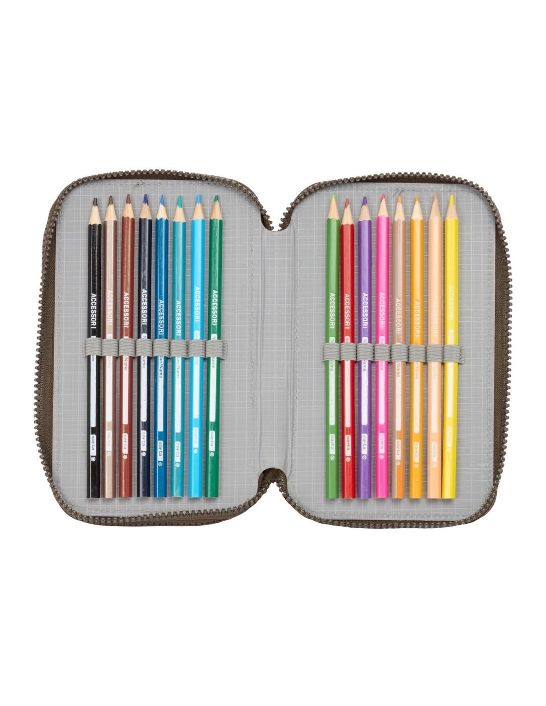 Tamaño: 12,5x5,5x19,5cm. Contiene 37 piezas: goma, lápiz de grafito, bolígrafo azul, sacapuntas, regla azul grabada, y semicírculo (primer compartimento), 16 colorines de madera (segundo compartimento). 14 rotuladores de colores (tercer compartimento).