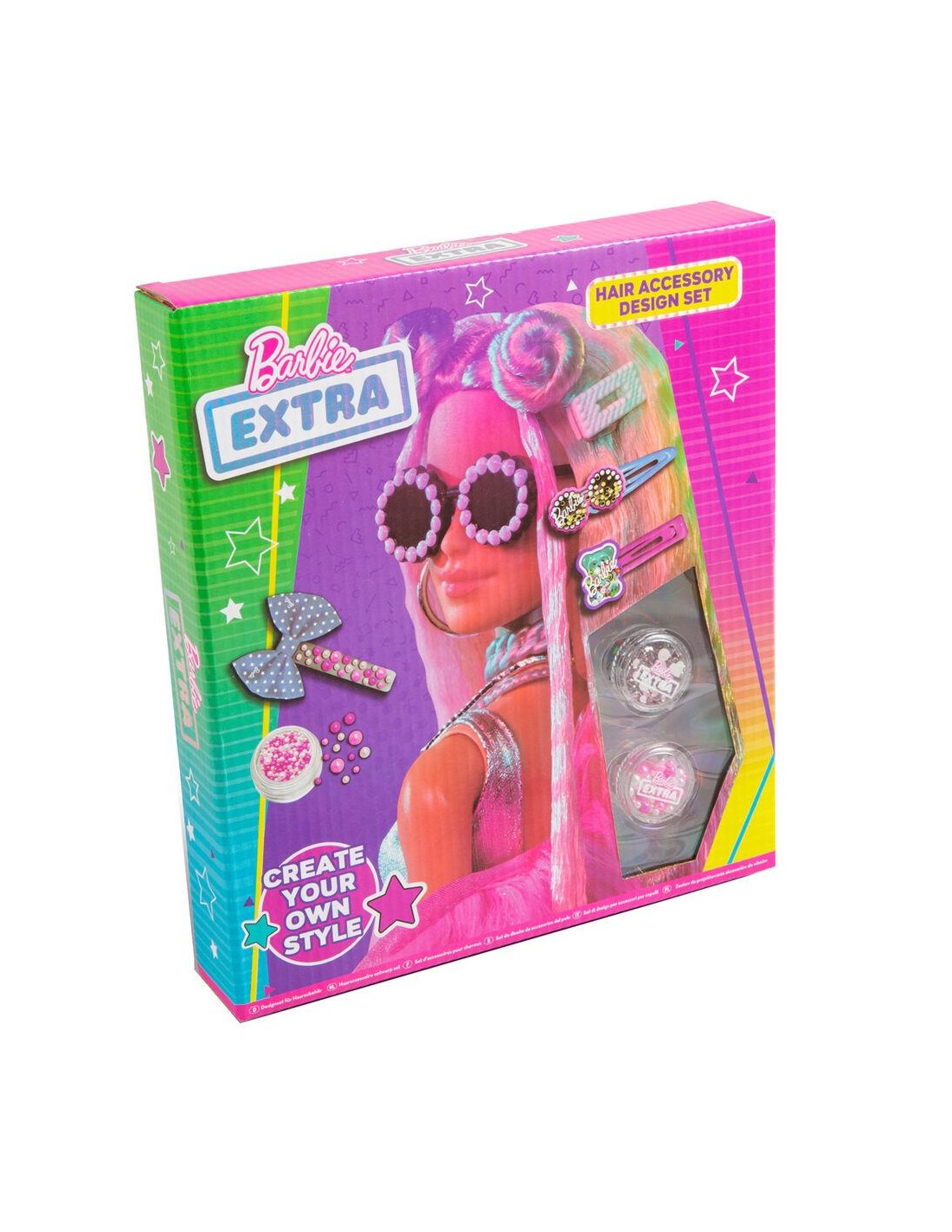 Tamaño: 22x4x25cm. Edad: 3+ años. Incluye 10 clips surtidos, 2 lazos de tela, 1 bote de perlas, 1 bote de gemas, 1 hoja de puntos adhesivos y 1 tubo de pegamento