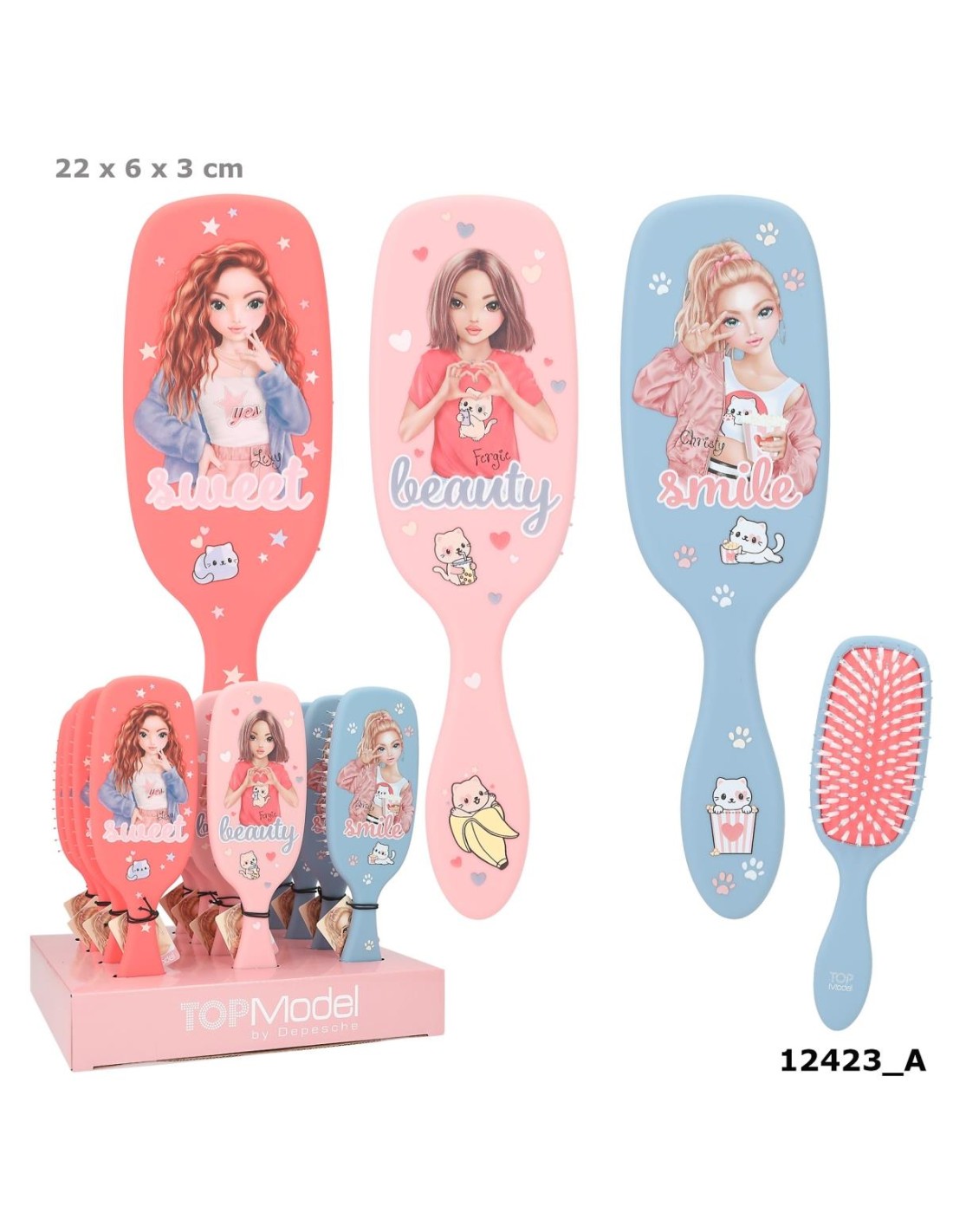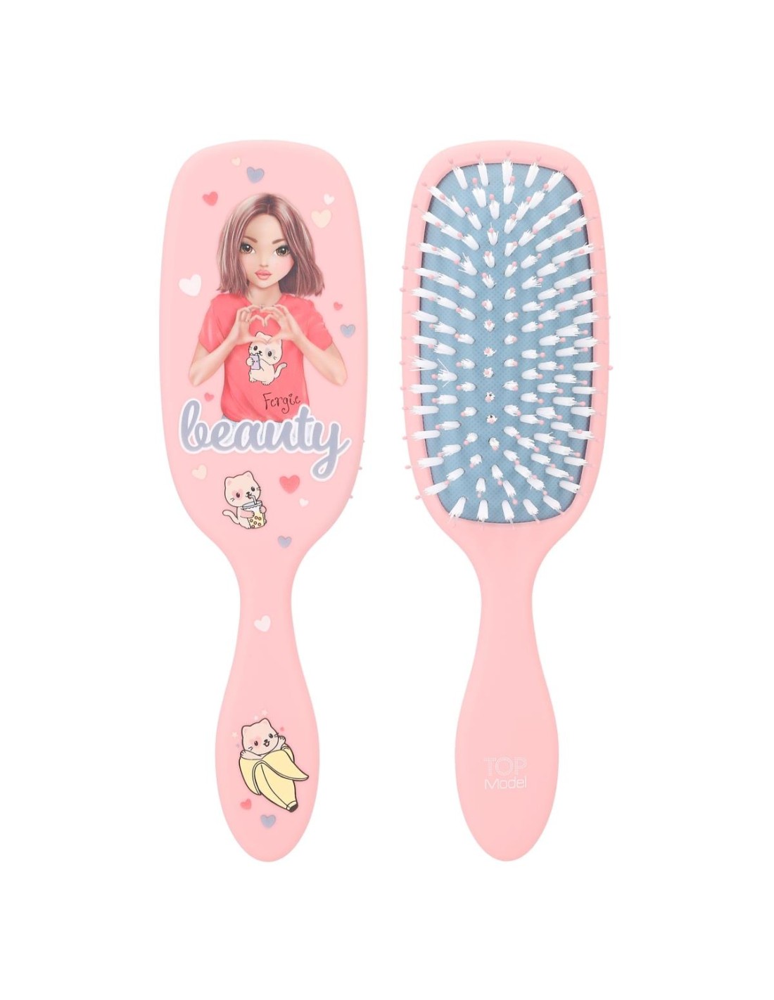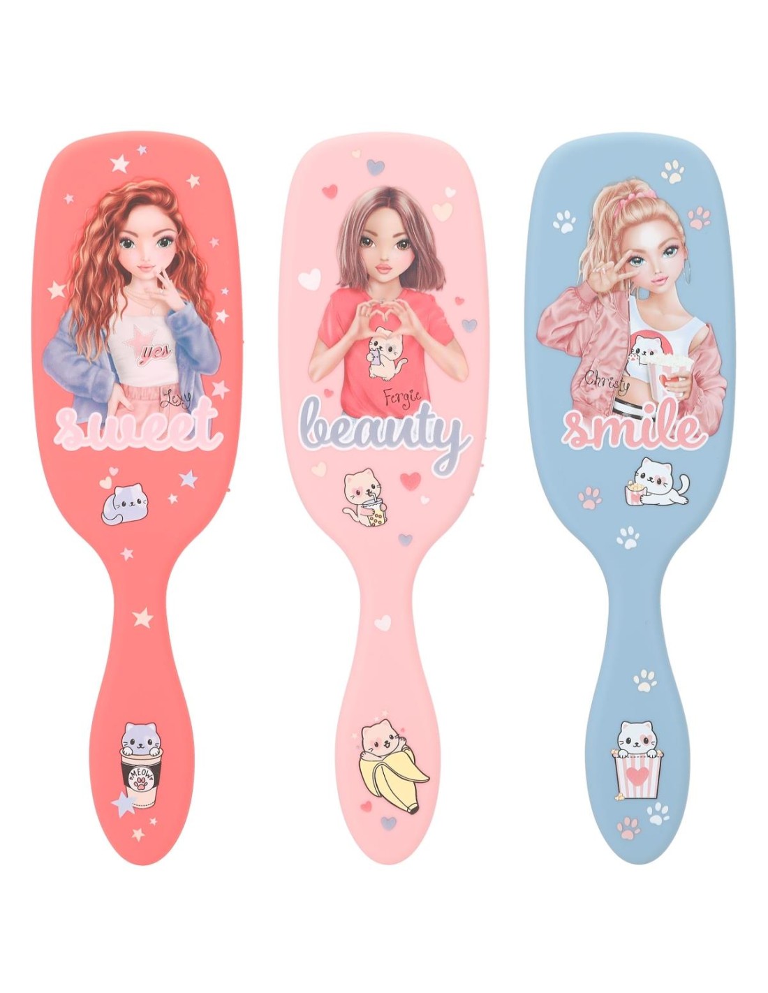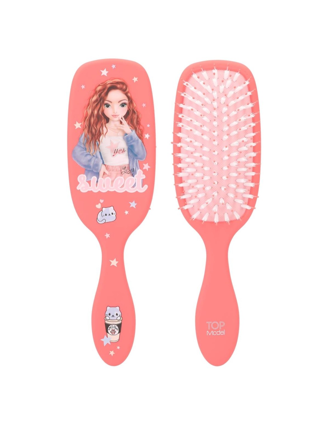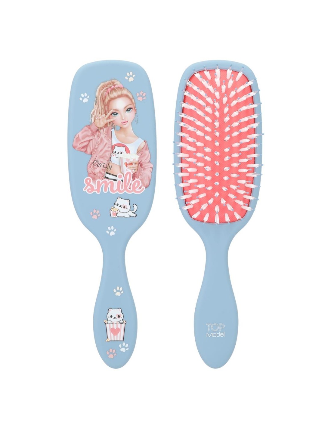 Estos cepillos de pelo de TOPModel con la clásica forma de raqueta de pádel se caracterizan por su superficie de goma que aúna un diseño cool con un agradable tacto suave. En rosa, azul y coral con maravillosos motivos de modelos y preciosos iconos de gatitos. La combinación de cerdas de nailon y de plástico de alta calidad hace que estos cepillos sean aptos para todos los largos de pelo, pero están recomendados especialmente para las melenas largas. Largo: 3 cm