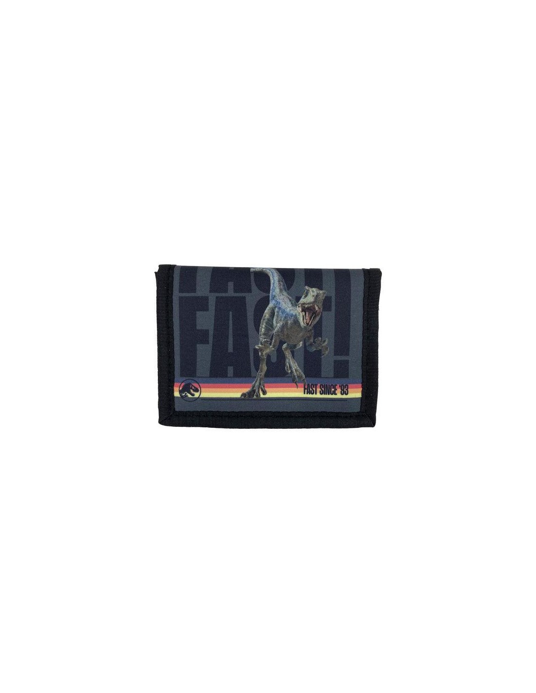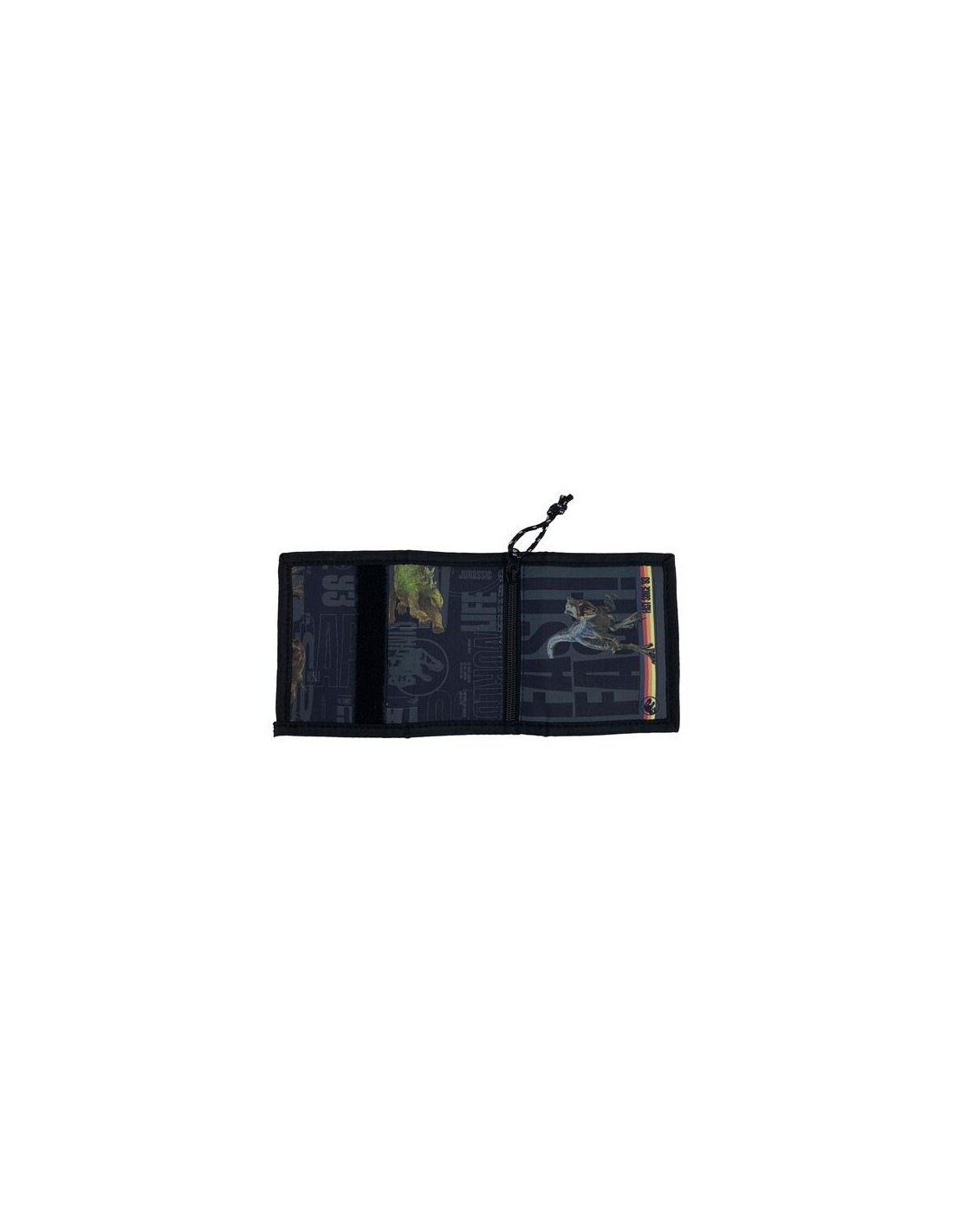 Billetera. Tamaño: 13x2x9,5cm. En la parte posterior dispone de una cremallera donde podrás guardar tus monedas. Original tirador con la marca de Jurassic World. En la parte interior cuenta con varios compartimento para tarjetas y documentos, además de uno grande para billetes. Cierre de velcro para mayor seguridad.