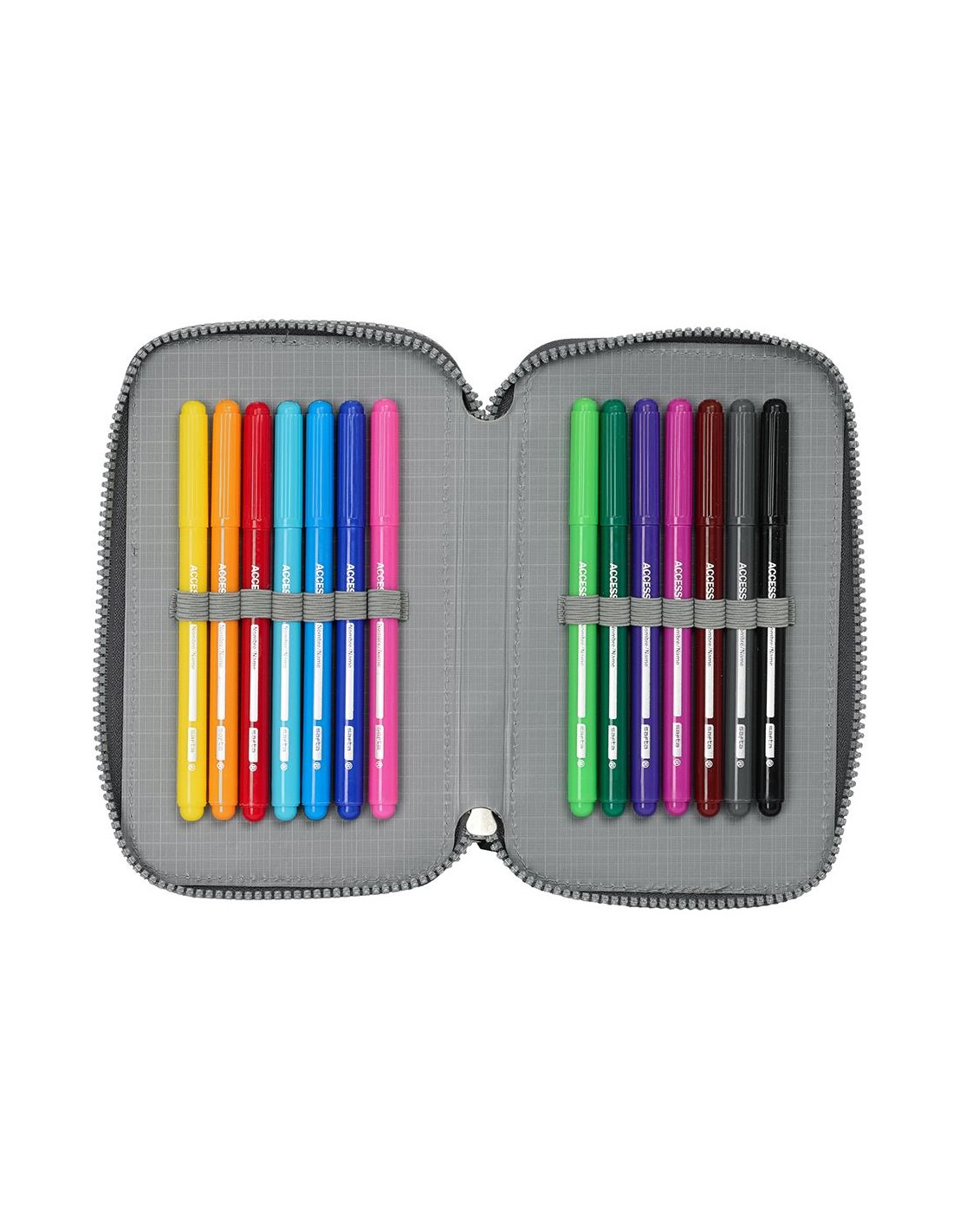 Tamaño: 12,5x19,5x4cm. Contiene 28 piezas: goma, lápiz de grafito, bolígrafo azul, y sacapuntas (1er compartimento), 10 colorines de madera, y 14 rotuladores de colores (2 compartimento).