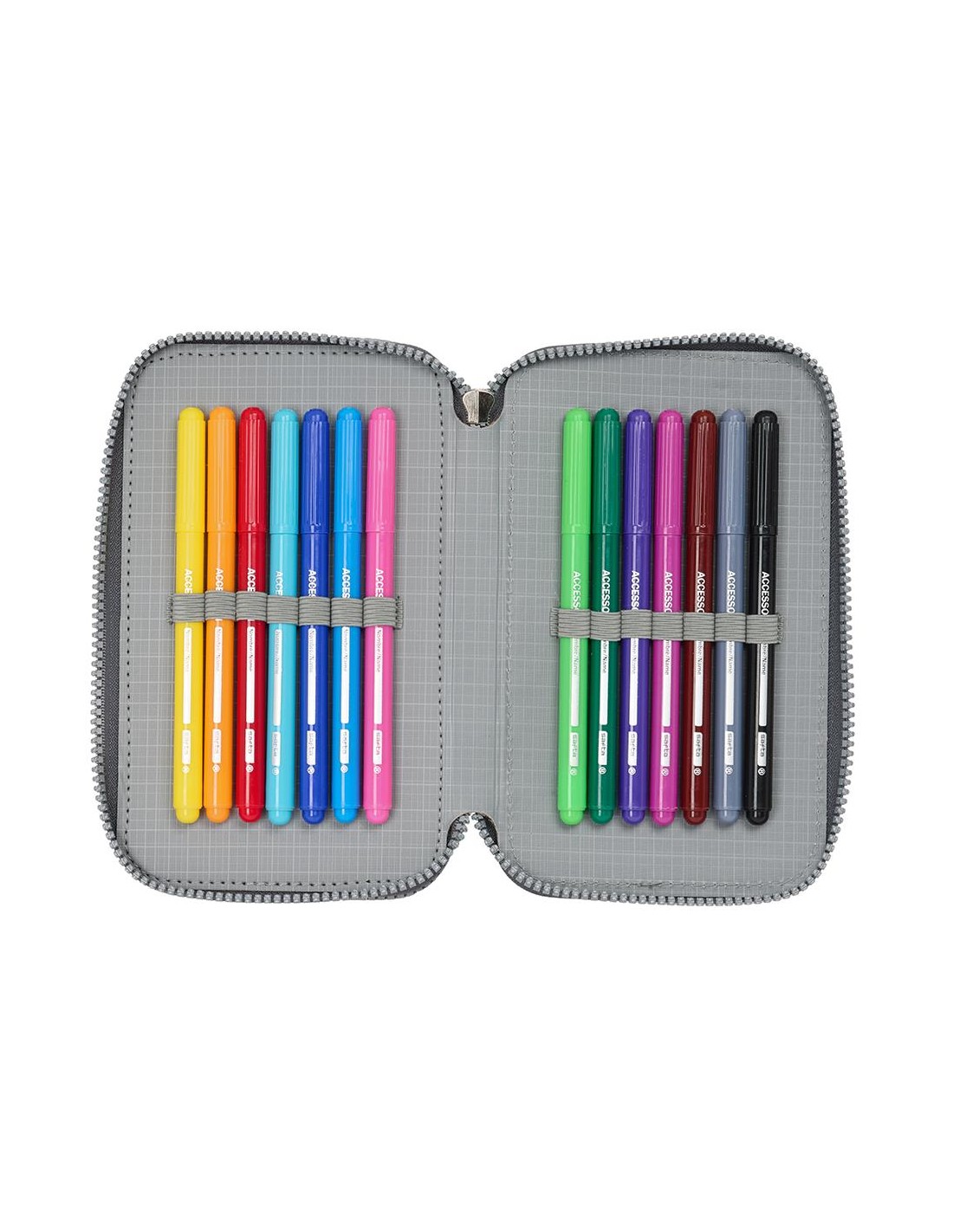 Tamaño: 12,5x6x20,5cm. Contiene 42 piezas: goma, lápiz de grafito, bolígrafo azul-rojo-negro, sacapuntas, regla, semicírculo (primer compartimento), 18 colorines de madera (segundo compartimento), y 16 rotuladores de colores (tercer compartimento).
