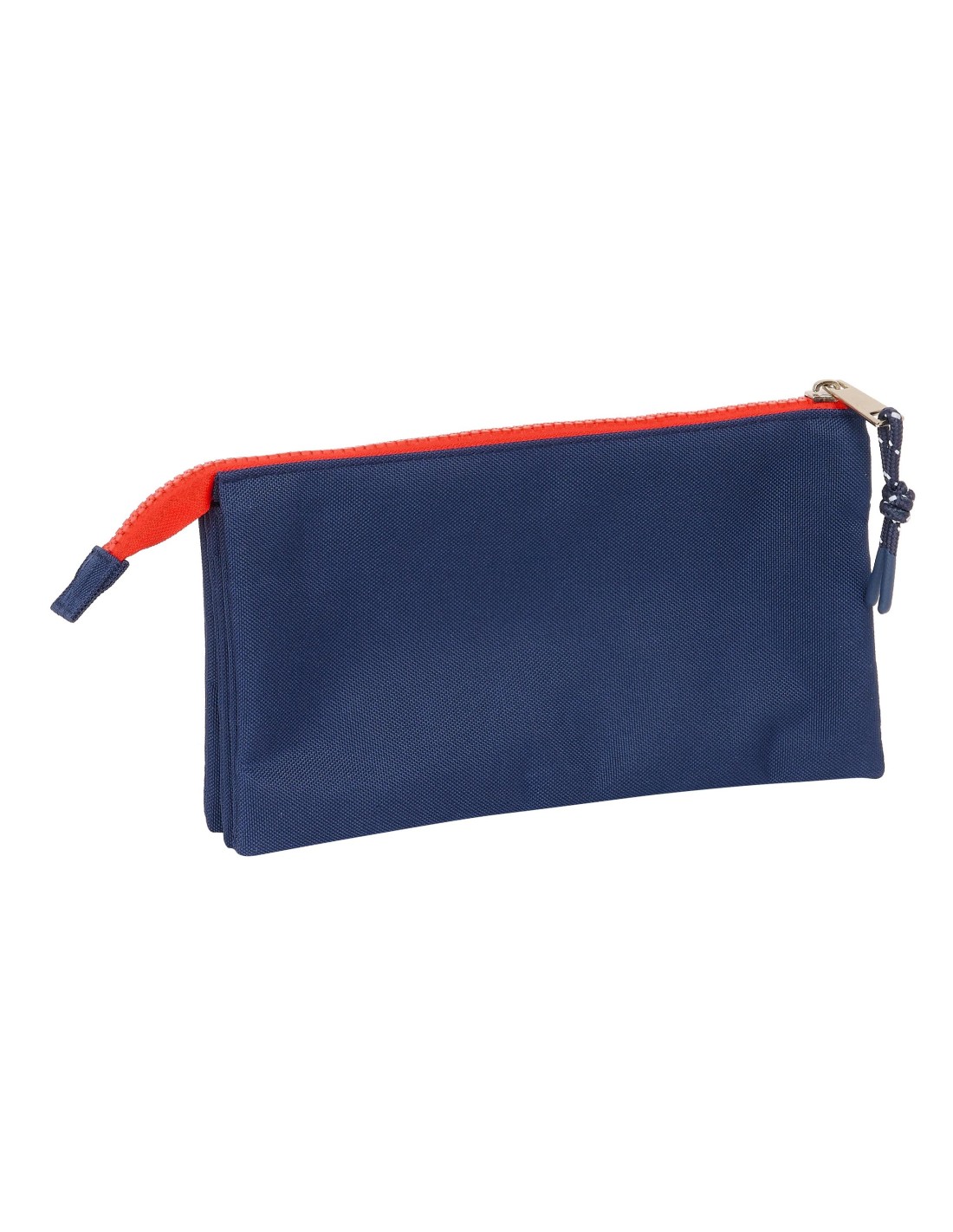 Tamaño: 22x3x12cm. Con 3 compartimentos separados con cremallera. Bolsillo interior central con cremallera.