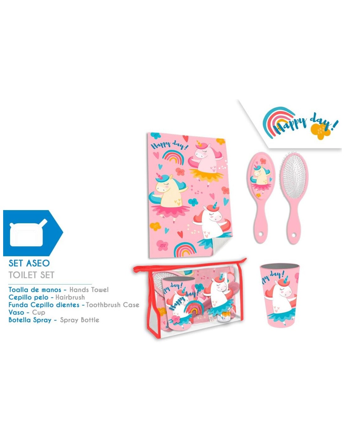 Contiene toalla de manos, cepillo de pelo, funda de cepillo de dientes, vaso, y botella spray.